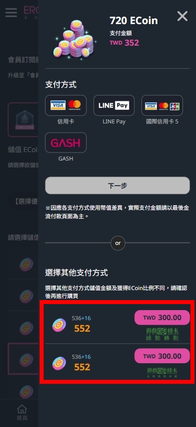 2. 選擇支付方式 →綠點轉點或是綠卡序號儲值。